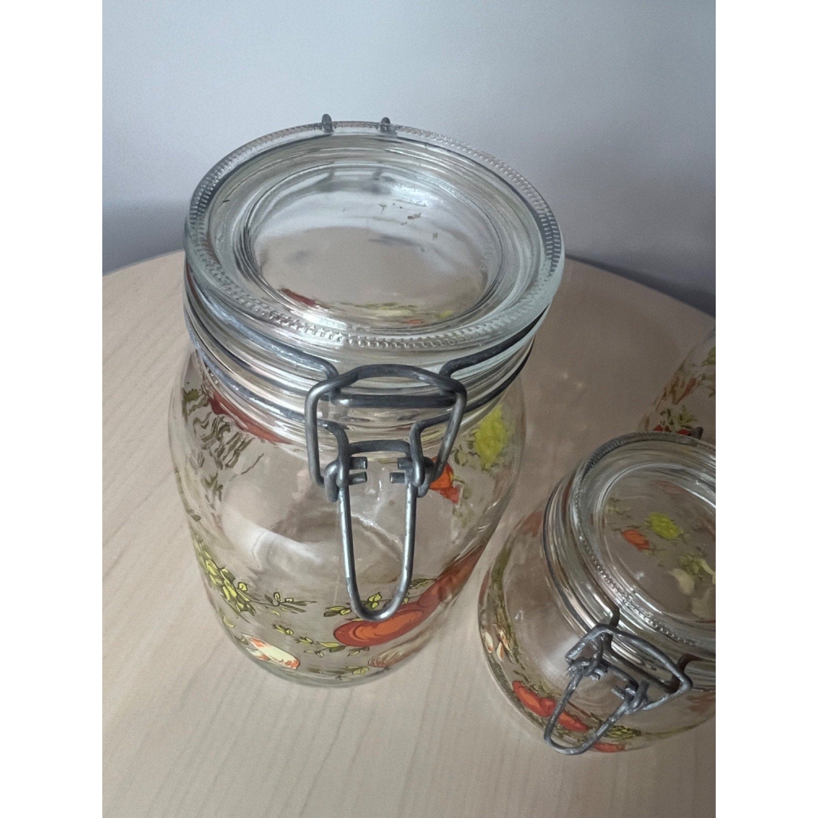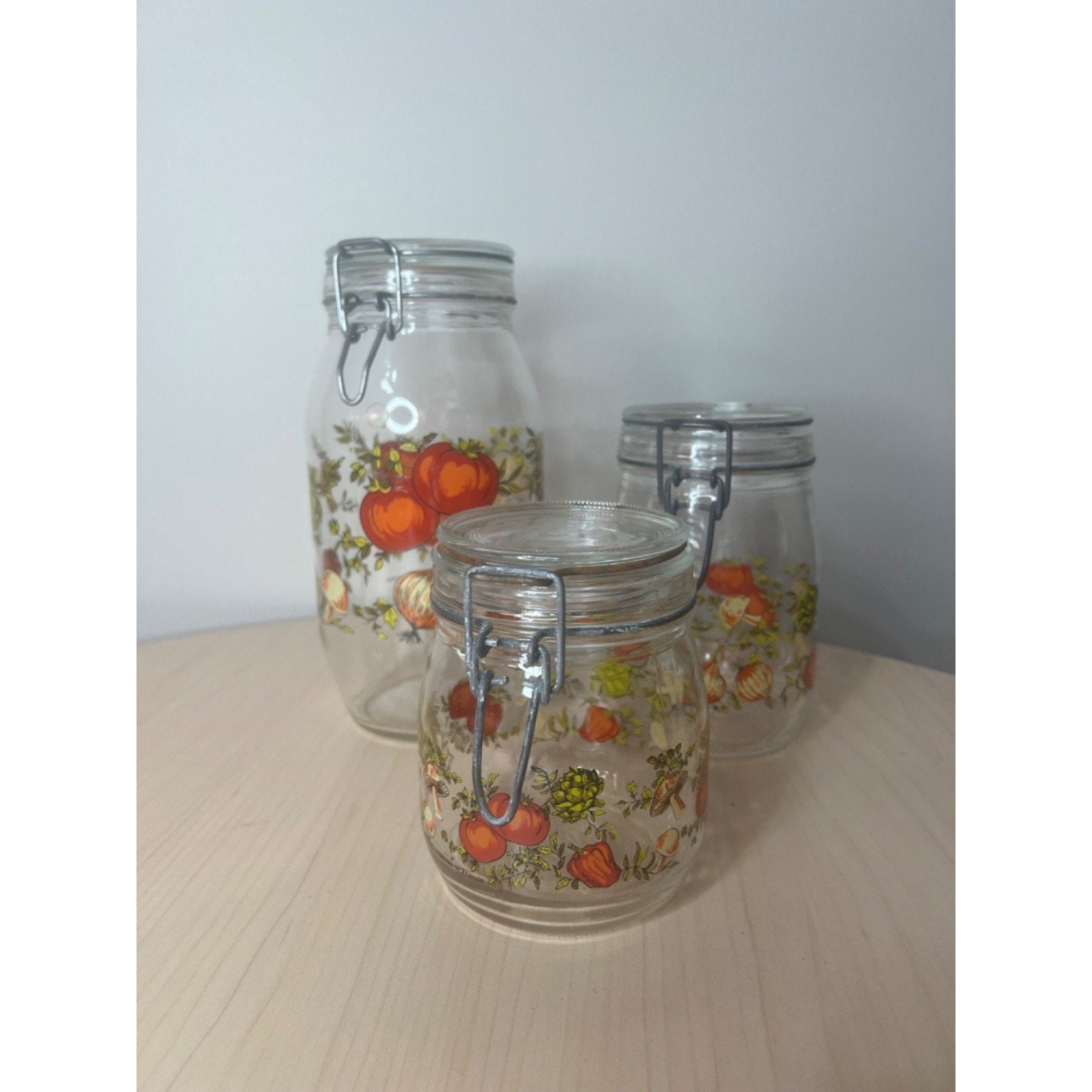 This vintage Arcoroc Spice of Life glass canister jar set of 3 from France features a unique Mushroom Tomato design in a retro style. The airtight jars have a clip lid lock and are easy to clean, making them practical for storing kitchen essentials. With a medium size and multicolor pattern, these round containers are 5.5",6.5" and 9.5" respectively, making them a charming addition to any kitchen or collectibles display.
