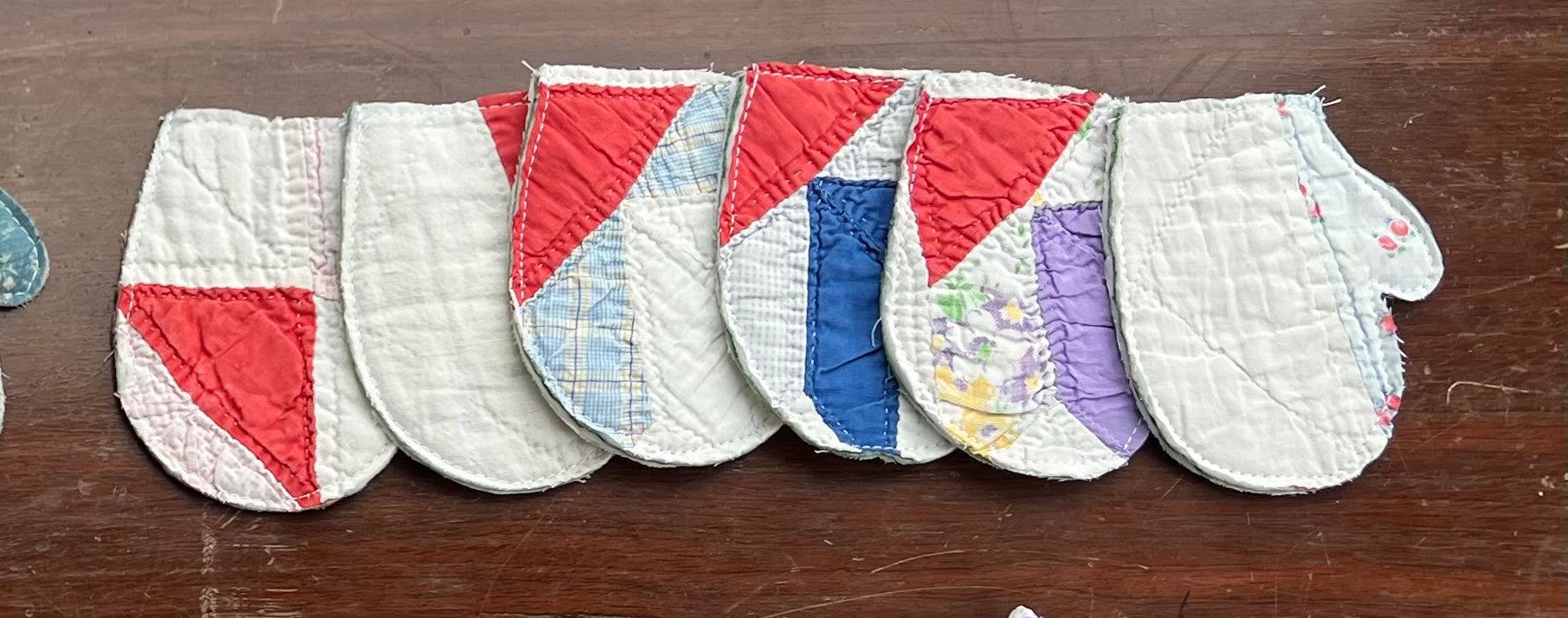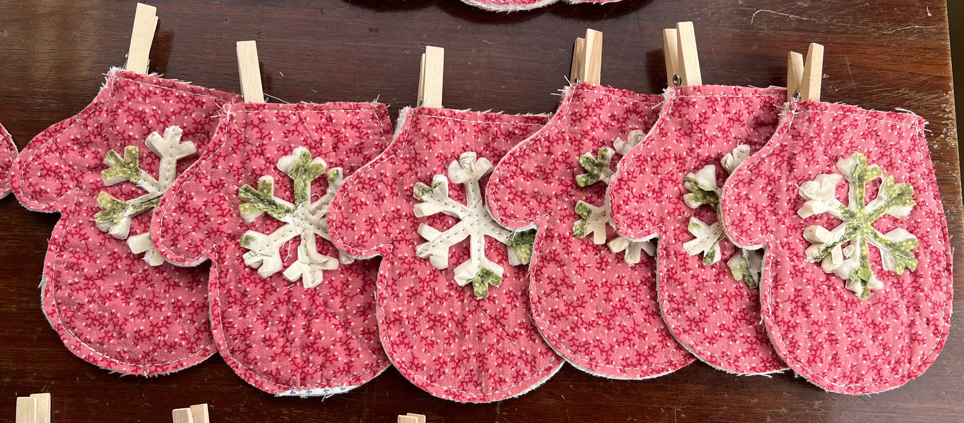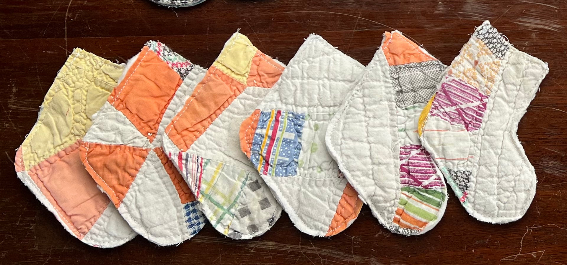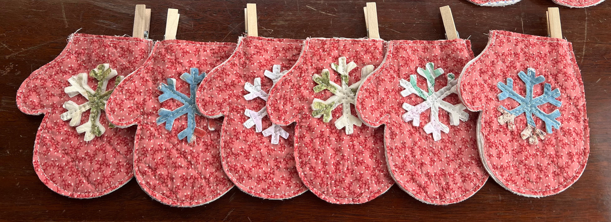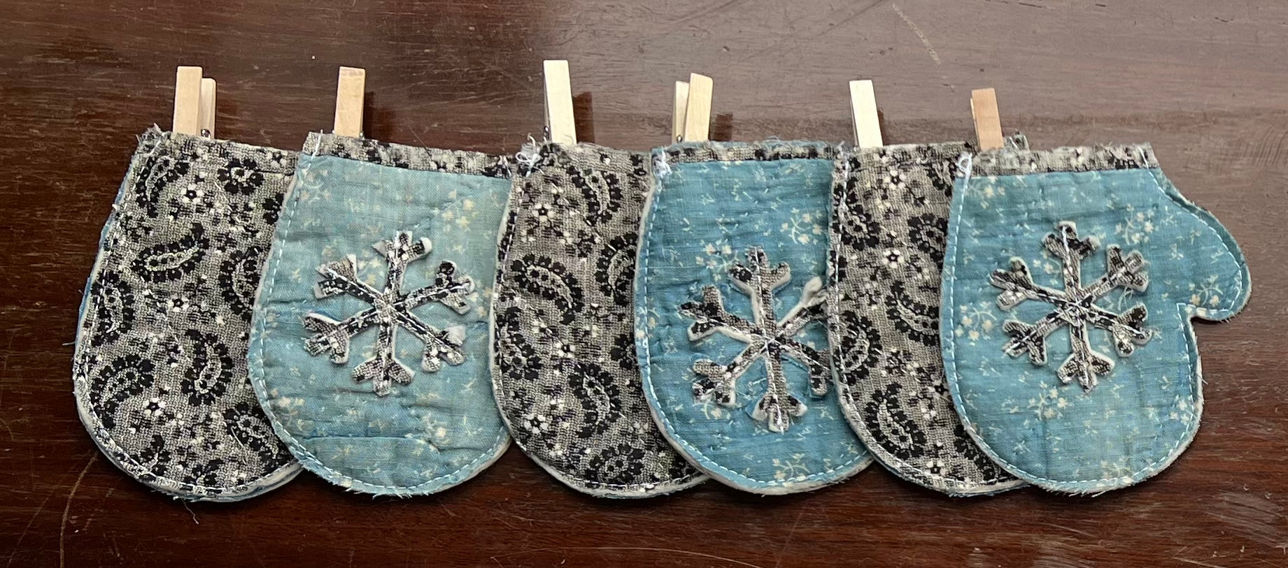 Trim your windows, tree or gifts with these adorable mittens and stockings. 2x3”, each come with a sturdy wood clothespin & length of jute to hang as a garland, but they can also be clipped to the tree, gift, etc. Made from vintage quilts, these are double sided so you can hang them in any direction. Set of 6 mittens or stockings.