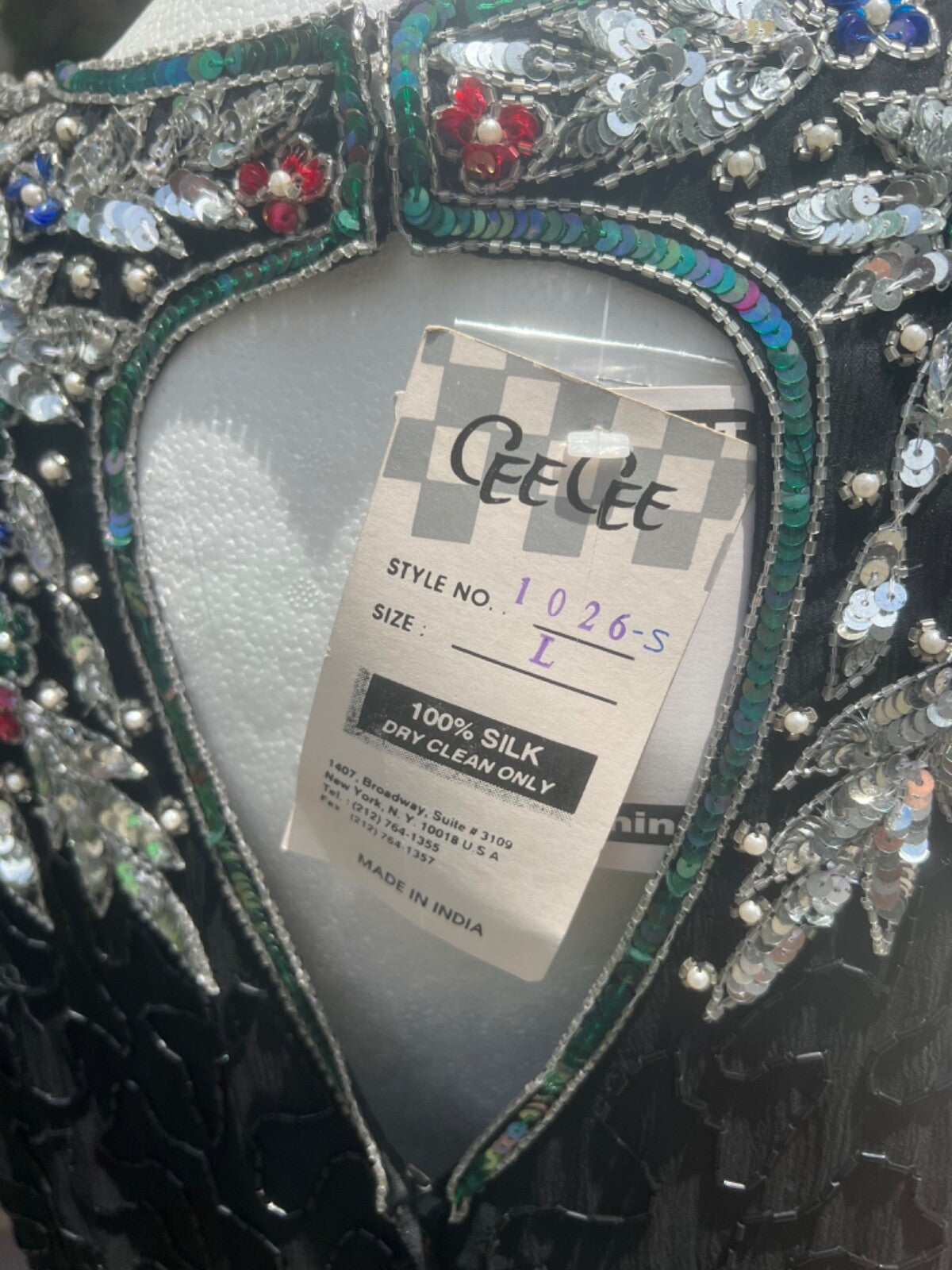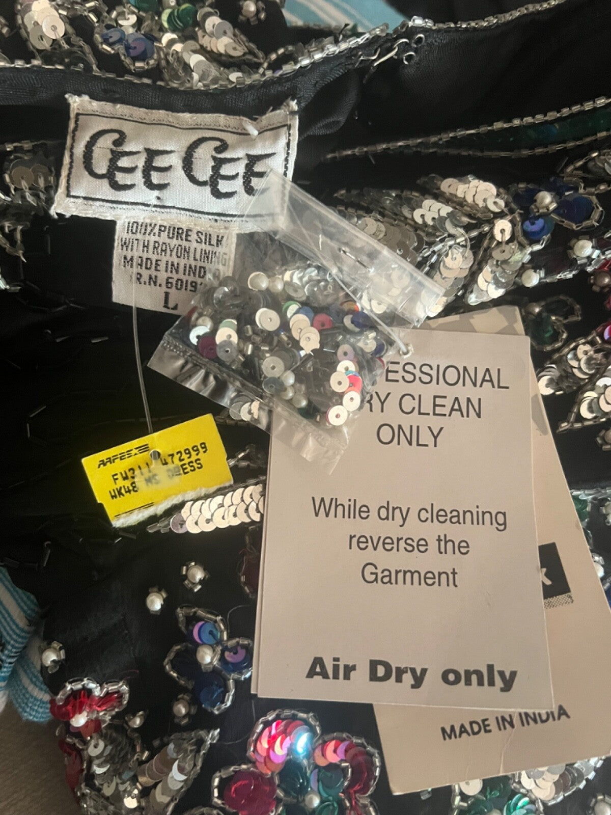 I gasped when I found this hanging in my sweet neighbor's closet. I've never seen anything like it with the tags still intact! It even still has the tiny package of replacement sequins and beads! 100% silk with a rayon lining, it is absolutely sparkly stunning. Size L.