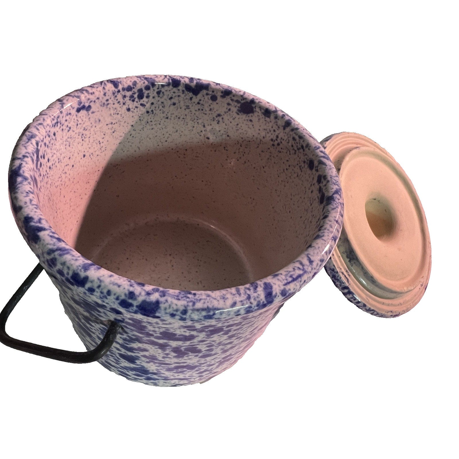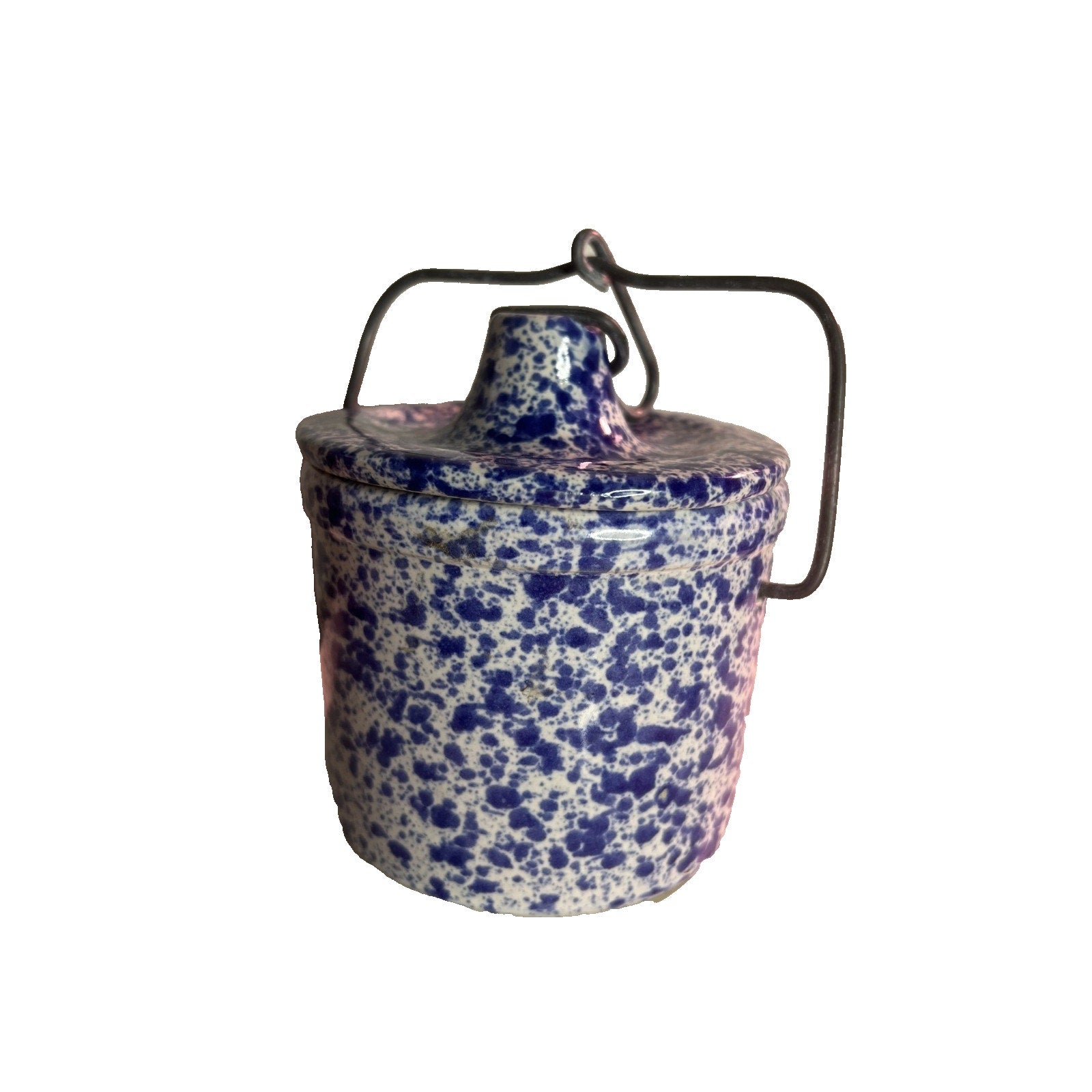 Vintage Stoneware Blue Speckled Crock Wire Bale Lid Cheese Crock Pottery
