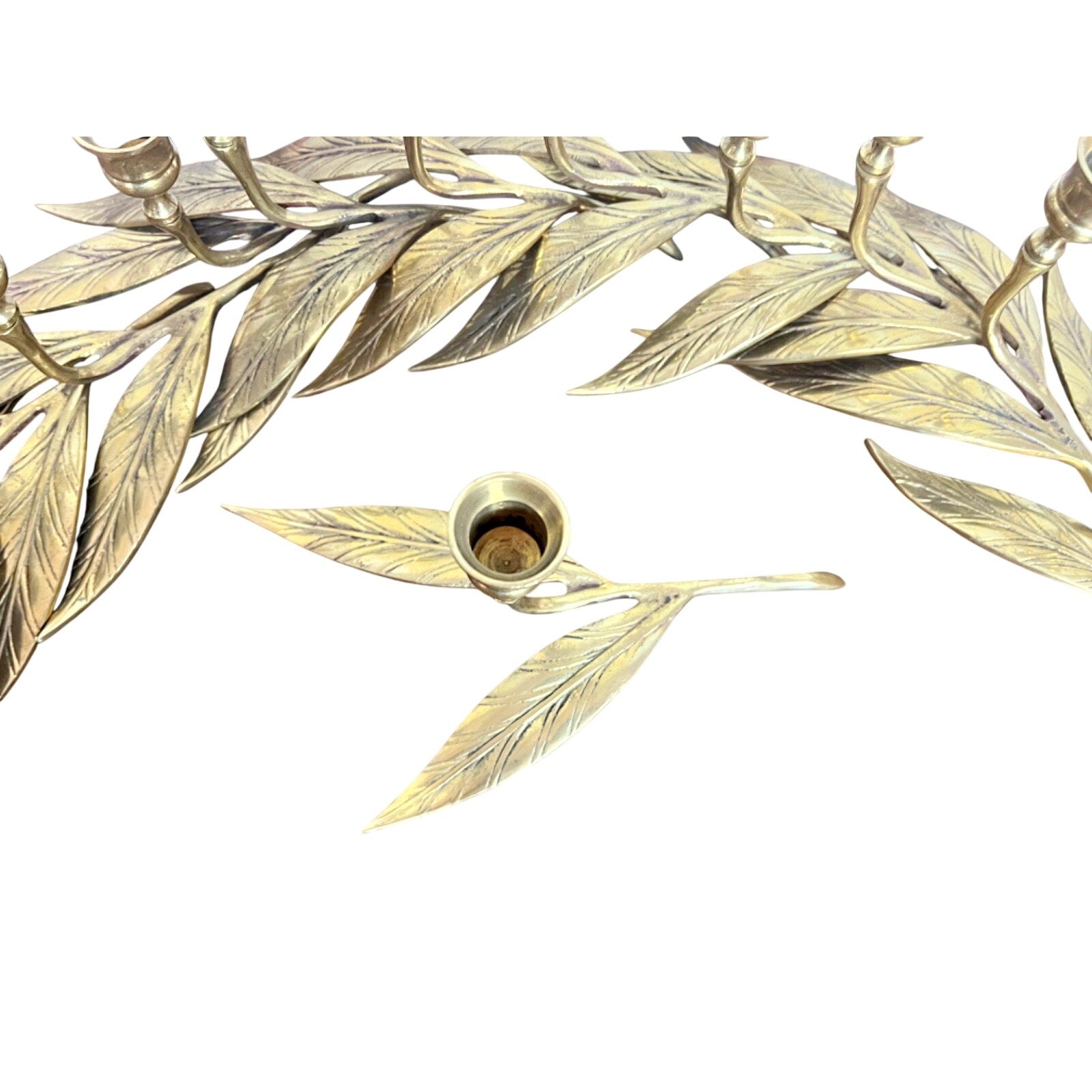 Gorgeous set of 12 graduated solid brass leaves make the most elegant candelabra for your piano, mantle or dining table. I've never seen another in all my years of brass hunting! Completely adjustable into any formation or conglomeration you prefer. See photos for details