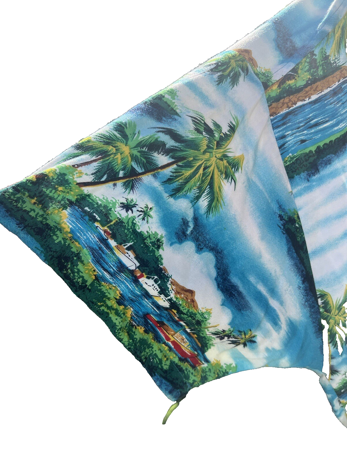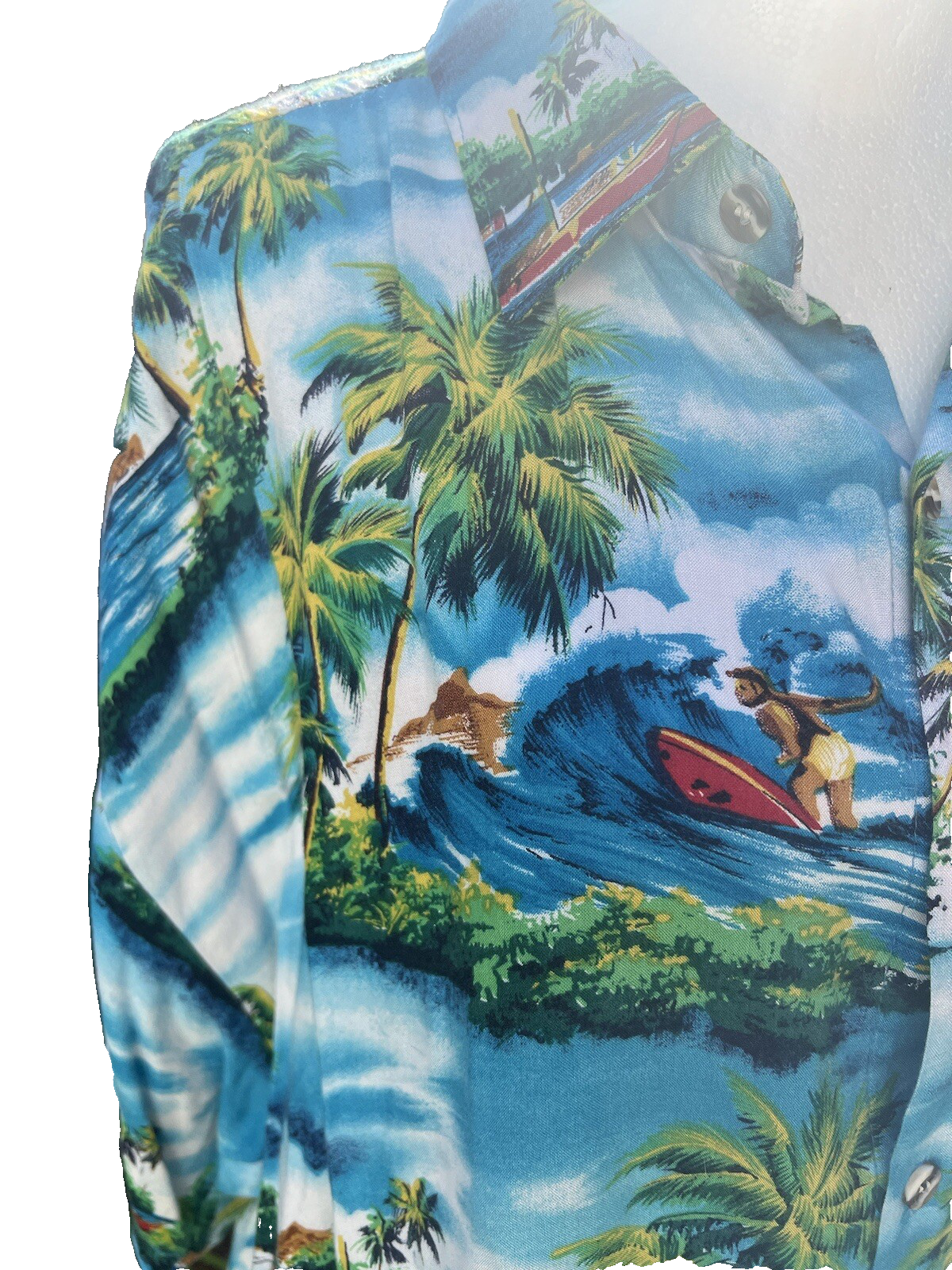 This might be the best vintage Hawaiian shirt I’ve ever found. As a quilter I was sorely tempted to use it for fabric, but this is a priceless antique to some stylish person out there! Vintage rayon silky goodness with scenic Hawaiian scenes printed in rich colors. Excellent condition. See photos for details